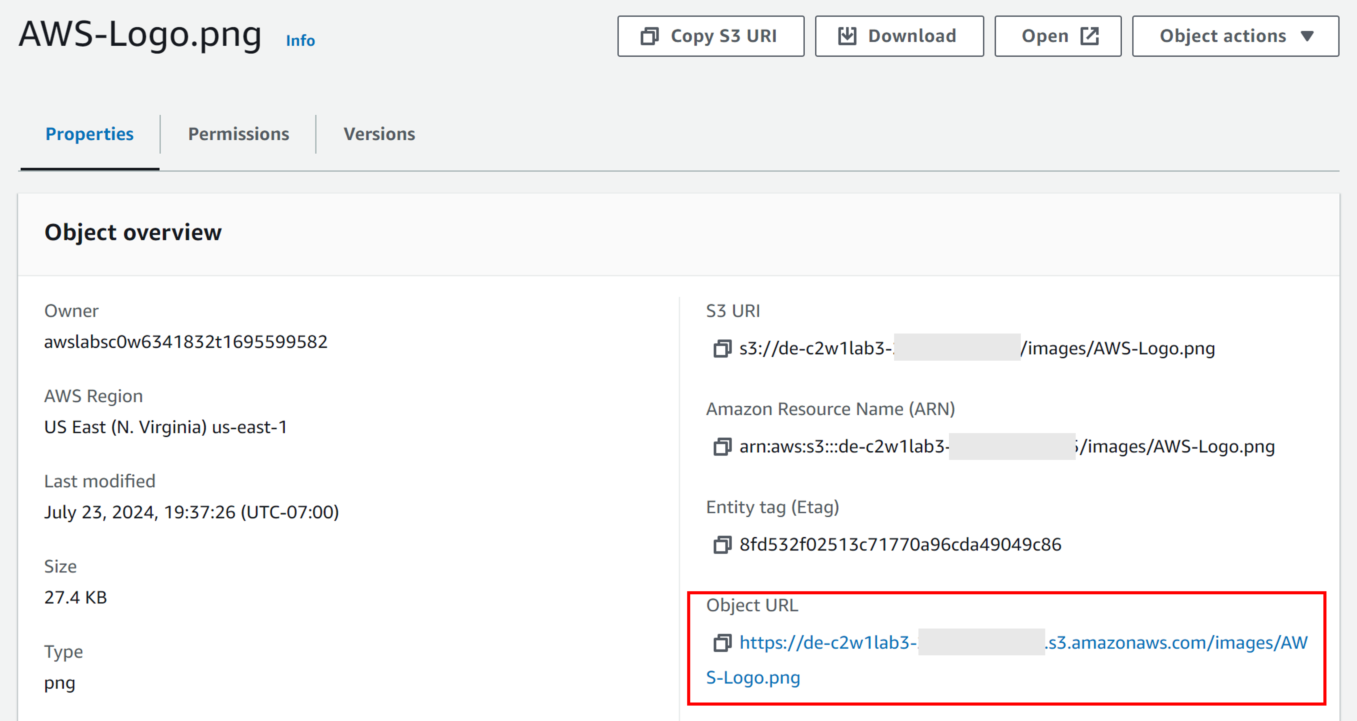 Now, go back to the S3 bucket in the AWS console and search for the file you just uploaded. Get its Object URL to download the new version of the file.